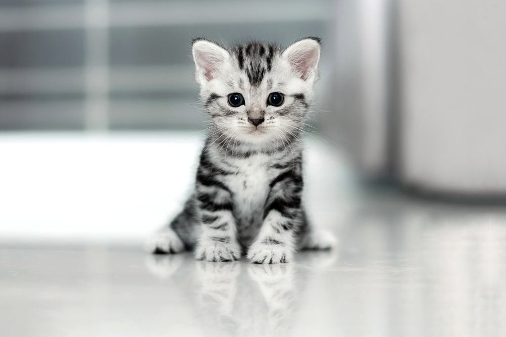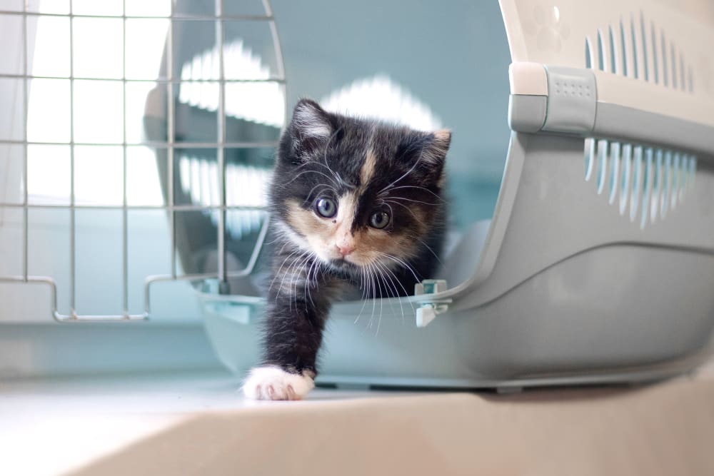 A kitten getting out from a dog crate at Banning Veterinary Hospital