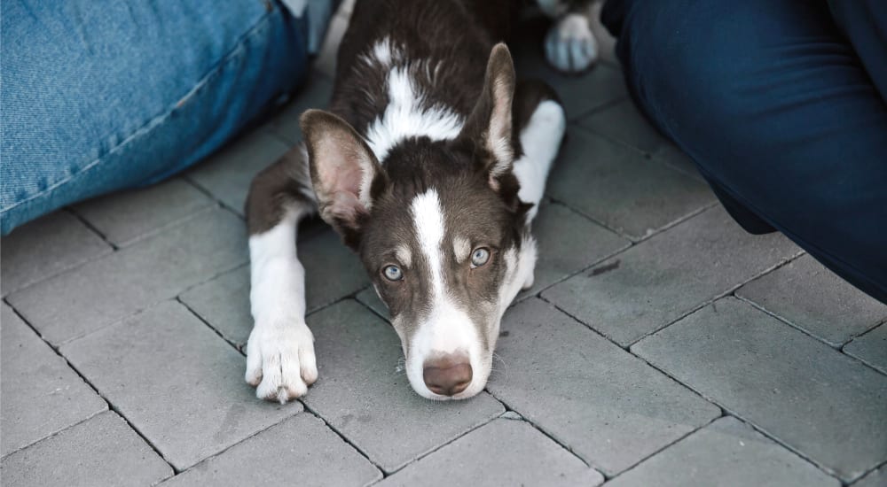 A dog laying on the ground and watching up at Banning Veterinary Hospital